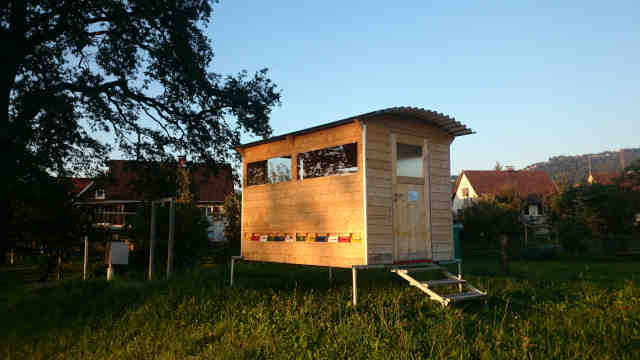Das BeeMobil ist ein mobiles Bienenhaus das 13 Bienenvölker bzw. 25 Ablegern Platz bietet und mit einem Autoanhänger sehr einfach an einen neuen Standort gebracht werden kann.