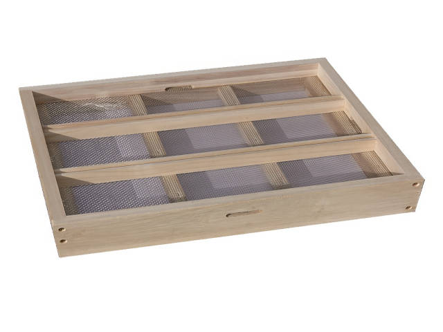 Der Liebig 3er-Ablegerboden ist ein niedriger Spezielboden der mit 2 Leisten eine Beute in 3 gleich große Räume teilt. Durch zwei Schiet die in die Beute eingehängt werden und durch die Nut in den Leisten des Bodens werden die Räume "Bienendicht" abtrennt.